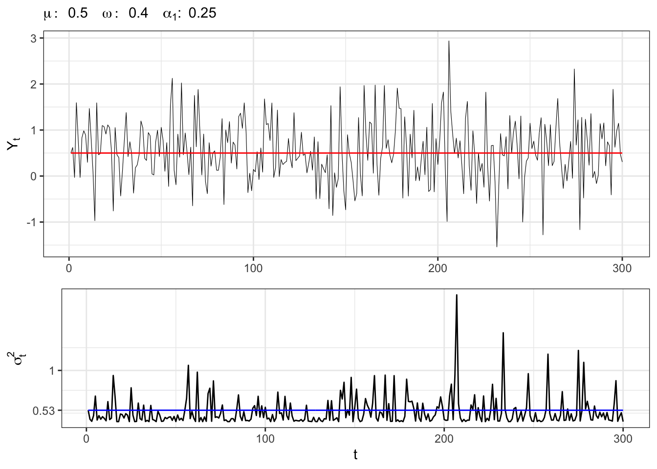 Example 21.1 Let’s simulate an ARCH(1) process with normal residuals, i.e.