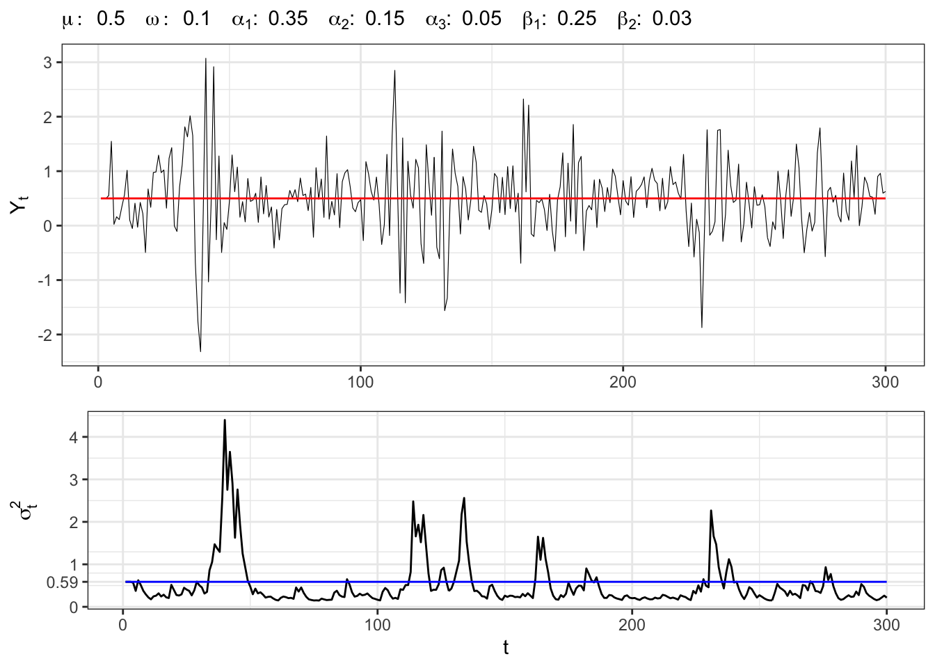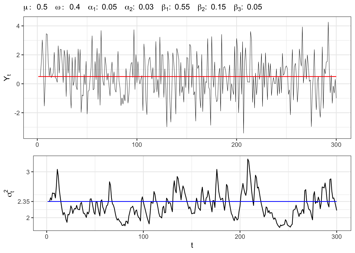 }Example 21.5 Let’s simulate a GARCH(3,2) process with normal residuals, i.e.