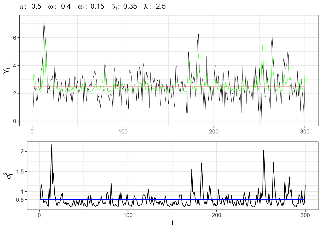 Example 21.7 Let’s simulate an GARCH-M(1,1) process with normal residuals, i.e.
